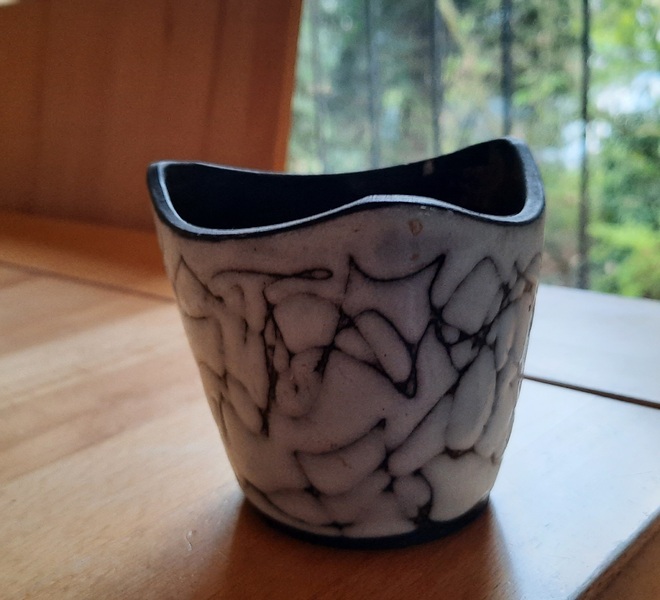 Kleine Keramikschale, handgetöpfert, weiß lasiert, brauner Untergrund, ca. 7cm hoch, 9 cm Durchmesser