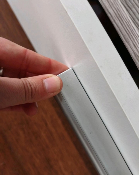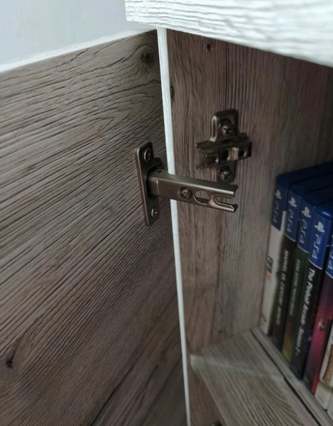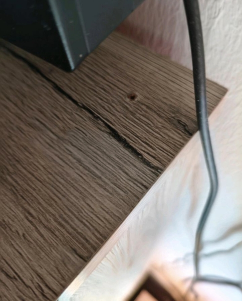 Außerdem hat der linke Schrank oben Löcher, weil ich es anfangs falsch zusammengeschraubt habe. Vorne an der Tür ist ebenfalls eine Macke vom Umzug.