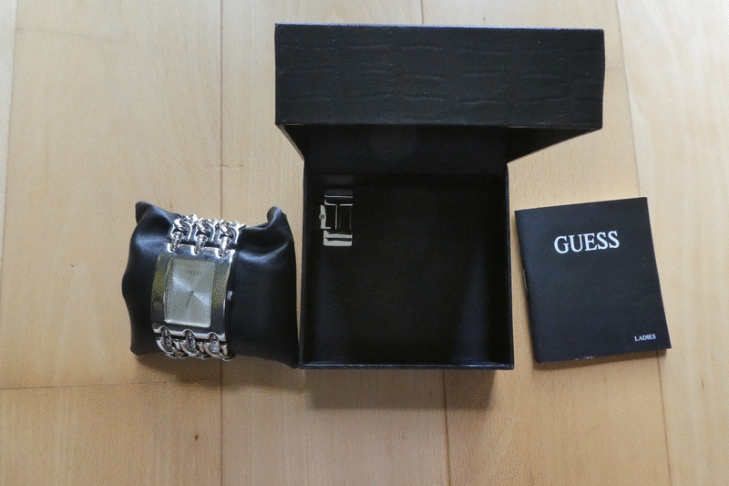wNEU 1 x kurz getragen GUESS Armbanduhr Modell Heavy Metal Neupreis 189 Euro gekauft ein Glied rausgenommen, liegt anbei und dann doch nur 1 x getragen Länge 18 cm ohne Verlängerung ohne Batterie, da ich die Uhr nicht genutzt habe NUR 100 Euro