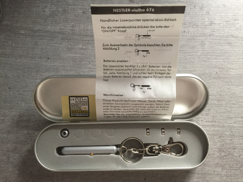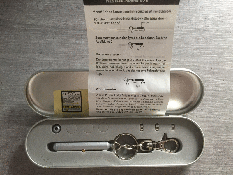 Handlicher Laserpointer weiß spezial Mini-Edition. Masse ca. D 0,8 x L 6 cm, mit Schlüsselring und Karabinerhaken. Diese tolle Rarität sucht jetzt einen liebevollen Neubesitzer und ist ein kostbarstes Geschenk oder eignet sich auch perfekt für das Schlüsselbund bzw. für die Handtasche. Unbenutzter und unbeschädigter Artikel in der Originalverpackung mit Firmenbranding, ggf. müssen die Batterien gewechselt werden. Tierfreier Nichtraucherhaushalt! Privatverkauf, siehe Fotos, Neupreis 29,95€ jetzt nur 12€, Versand (€ 3,00) bei Kostenübernahme möglich