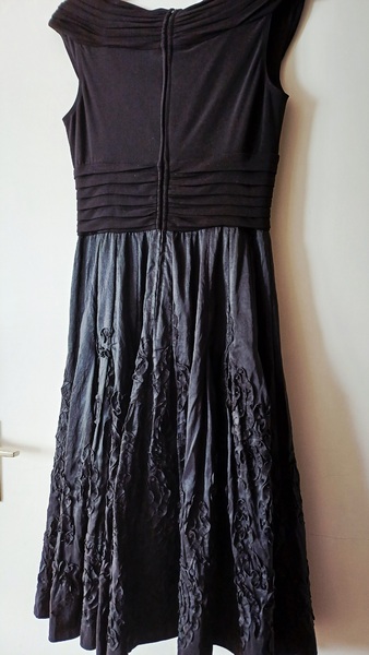 Das Rockteil ist aus Seiden Stoff mit floralem Muster. Schöner Stoff in sich gemustert, toll verarbeitet. (s. Bilder). Auf Rückseite es gibt einer Reißverschlüss.