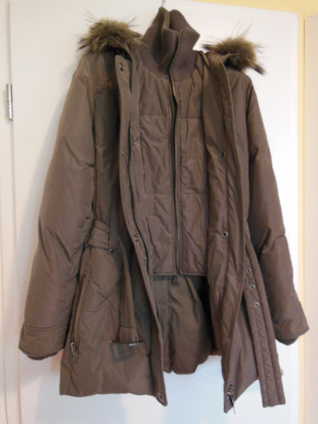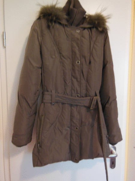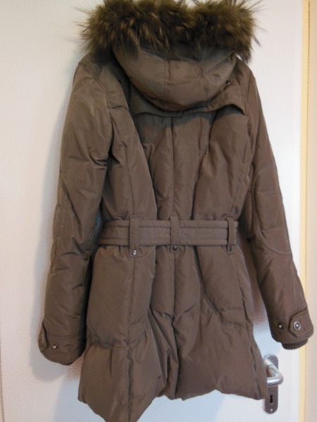 Strickstehkragen , Ärmelabschluß mit Strickbündchen , Innentasche , Außentaschen mit Reißverschluß , Kapuze mit abknöpfbarem Pelzbesatz , Gürtel.