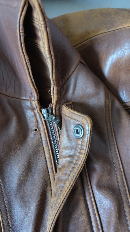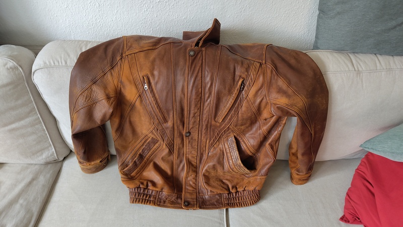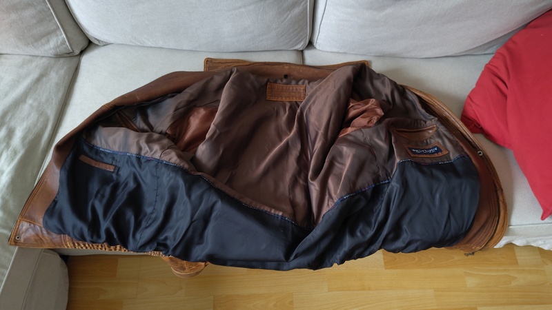 Die Jacke ist sehr getragen (sieht man sehr gut an den Schultern) und hat inzwischen auch zwei kleine Makel:
