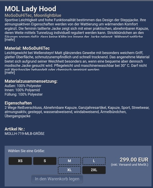 Ich möchte meine neue und ungetragene Wellensteyn Daunenjacke mit Kapuze verkaufen. Die Farbe ist dunkelblau, Größe XL, UVP = 299,- € lt. Wellensteyn Webseite.
