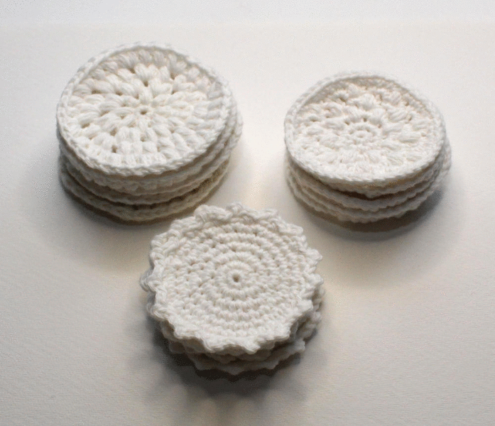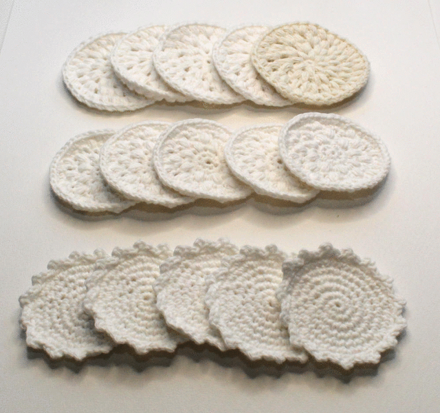 Ich habe zu viele davon gehäkelt und gebe nun welche davon ab. Angenehme Textur, sehr weich, ideal, um eine Gesichtsmaske abzunehmen 15 Stück - ø 6, 6,5 und 7 cm - Farben: weiß, natürweiß - Material: 100 % Baumwolle, waschbar bei 60 °C