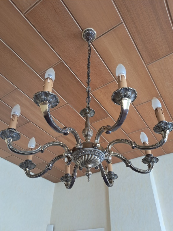 Hallo ich verkaufe hier eine Hängelampe 8 armig aus Messing in der Farbe brüniert. Sie ist voll funktionsfähig und kann in 2 Stufen geschaltet werden. Bei Interesse gerne melden. 35 €.