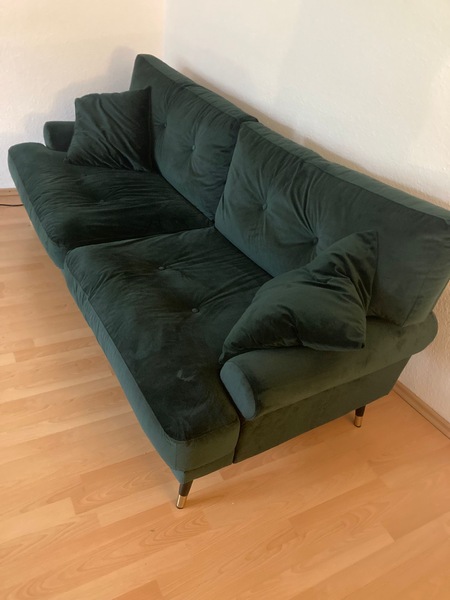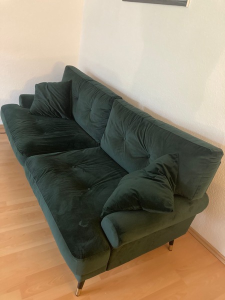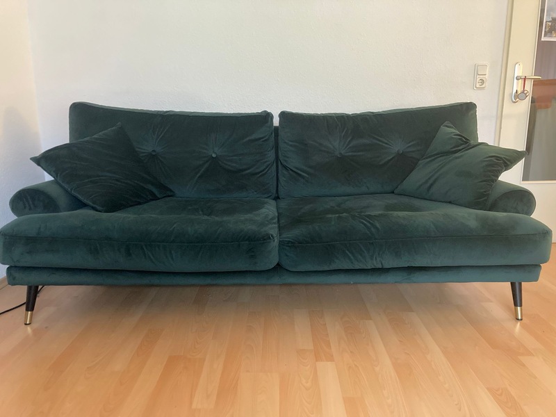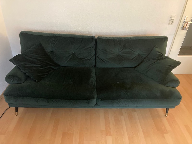 Ich verkaufe ein super schönes dunkelgrünes 3er Sofa aus hochwertigem Samtverlour inklusive 2 Sofakissen. Das Sofa ist ca 1.5 Jahre alt. Es ist in einem sehr guten Zustand und hat keine Mängel. Der Neupreis liegt aktuell bei 700€.