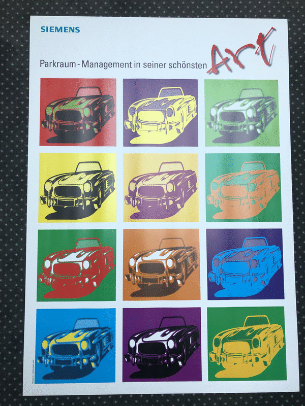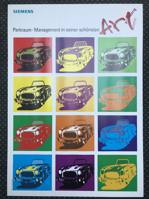 in Museumsqualität - Anspruchsvolles Werbeplakat, Motiv: Siemens Parkraum-Management in seiner schönsten Art, B60xH84 cm. Dieses schöne Bild aus einer geringen Auflage sucht jetzt einen liebevollen Neubesitzer, ein tolles Geschenk mit bleibender Erinnerung, eignet sich perfekt für eine Dekoration, unbeschädigte Artikel im neuwertigen Zustand, Tierfreier Nichtraucherhaushalt! Privatverkauf, siehe Fotos, jetzt nur 19€ oder machen Sie gerne ein Angebot, Versand (€ 6,00) bei Kostenübernahme möglich