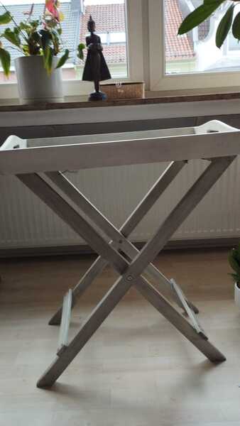 Aus Platzgründen verkaufe ich diesen schönen Tablett--Tisch. Er ist zusammenklappbar und hellgrau lasiert. Preis: 20 Euro, abzuholen in der Bremer Neustadt.