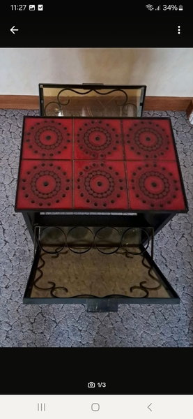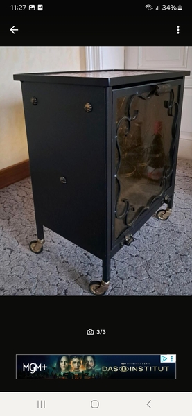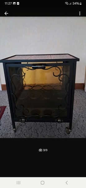 Hallo ich verkaufe hier eine Vitrine aus Metall, sie kann auf beiden Seiten aufgeklappt werden und es ist für 8 Flaschen Platz. Sie ist aus Metall mit Rollen. 35 €. Bei Interesse gerne melden.