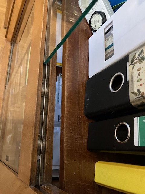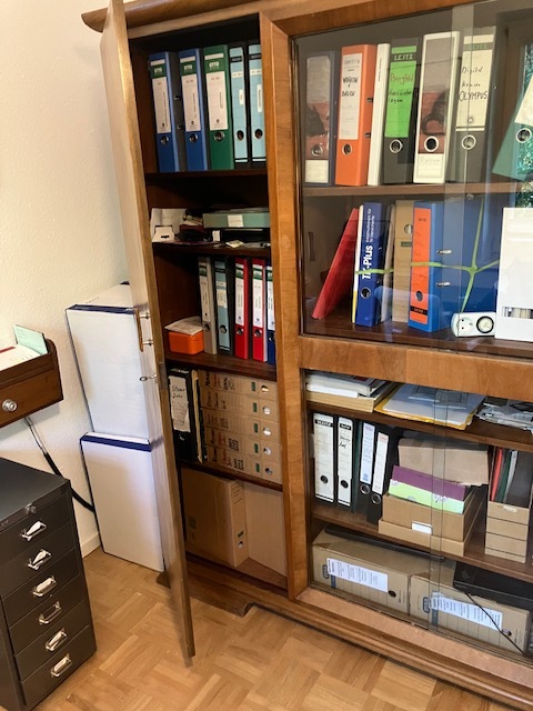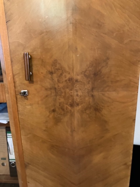 Vitrinenschrank / Bibliotheksschrank art art deco: Raumwunder aus Vollholz Nußbaum furniert, schöne Furnierarbeit, Schellackoberfläche, Bakellit-Griffe, 4 Glasscheiben mit eingeschliffenen Griffen und geschliffenen Kanten, alle Fachböden höhenverstellbar, zerlegbar. Maße: 197 x 184 x 49 (BxHxT). 170 EUR