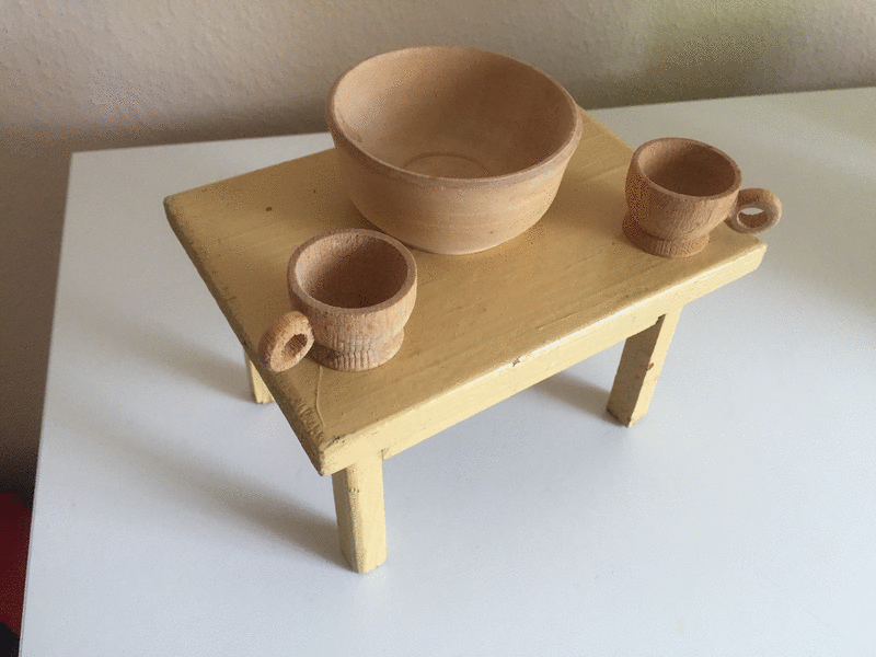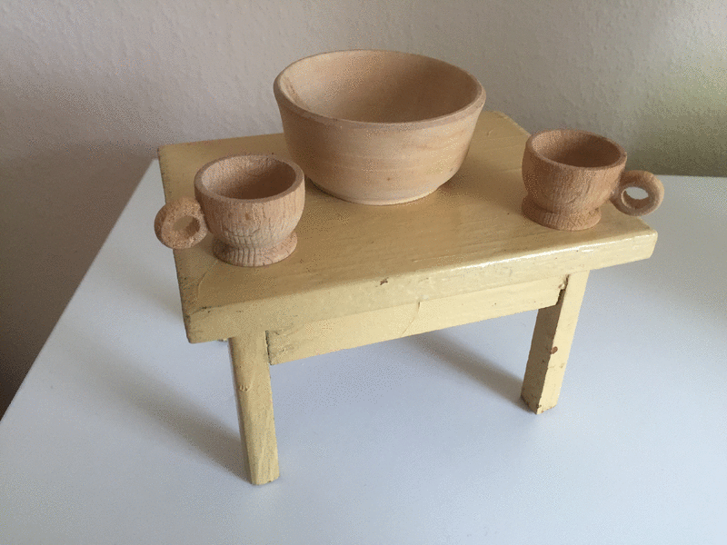 um 1950 - Der aufwendig gearbeitete Puppentisch aus massivem Echtholz, mit 2 Tassen und einer Schüssel, bietet viel Platz für die Puppen. Maße: Tisch ca. L13,5 x B9,5 x H8,5 cm, Tassen Ø 2,7 x H2 cm, Schüssel Ø 6,5 x H3 cm. Das Zubehör passt genau auf den Küchentisch und ist ein Traum für alle Puppenmamas und -papas. Diese Rarität, sucht jetzt einen liebevollen Neubesitzer und ist ein tolles Geschenk für Ihr Kind bzw. Enkelkind oder eine Trophäe für Ihre Sammlung. Sehr selten und für Sammler ein Muss. Eignet sich auch perfekt für eine Dekoration. Unbeschädigter Artikel im sehr guten Zustand. Tierfreier Nichtraucherhaushalt! Privatverkauf, siehe Fotos, jetzt nur alles zusammen 15€, Versand 4,00€ bei Kostenübernahme möglich