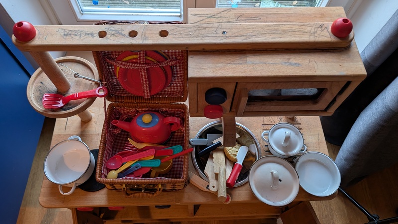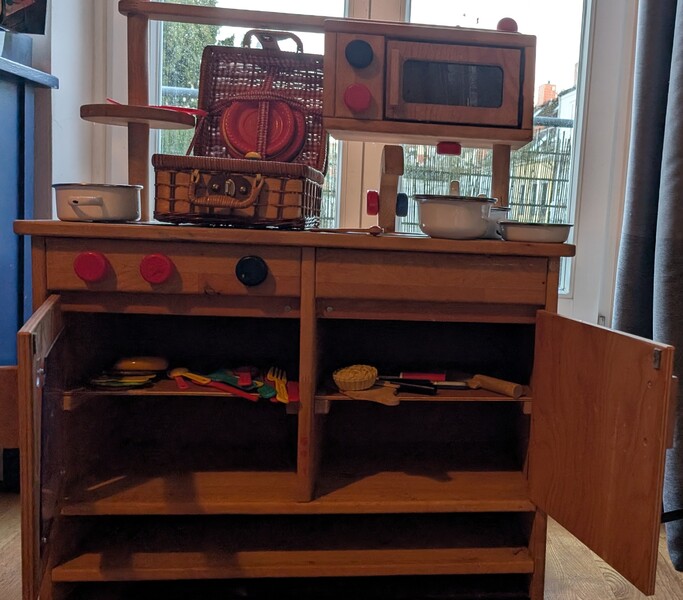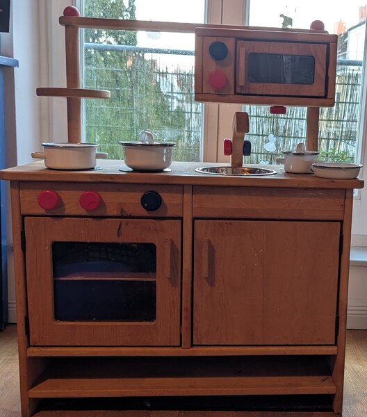 Hi. Verkaufe unsere Vollholz Kinderküche (produziert vom Martinshof 2018) mit Zubehör (bei Bedarf ist auch noch mehr verfügbar). Die Oberfläche weist z.T. Buntstiftspülen auf. 45 Euro vb mit dem sichtbaren Zubehör. Abzuholen im Viertel...