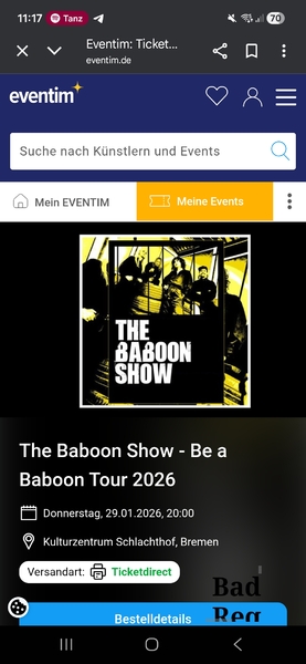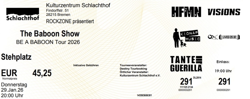 Verkaufe eine Karte für das Konzert The Baboon Show am 29.1.26 im Schlachthof.