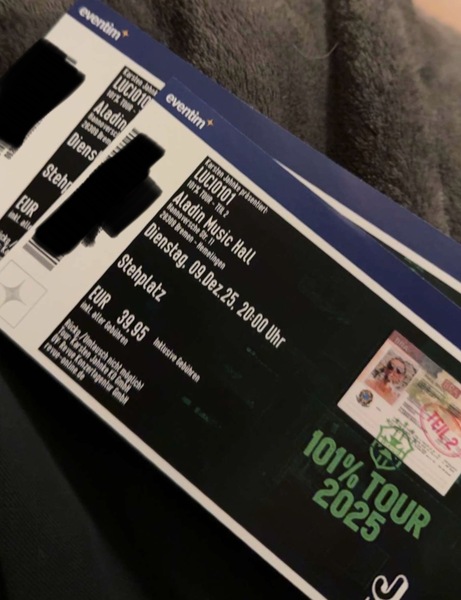 verkaufe zwei tickets für Lucio101‘ show am 09.12.25 in der Alladin Music Hall in Bremen. Bei interesse gerne melden! nur Abholung! 40€ pro ticket