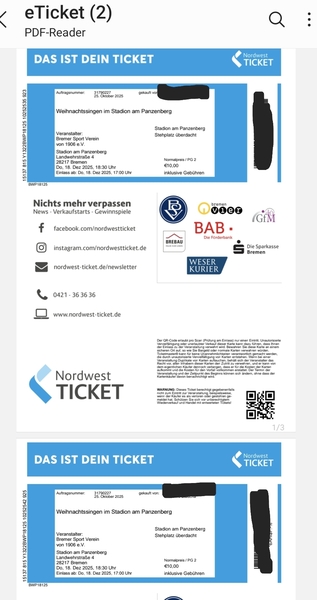 2 Tickets für das Weihnachtssingen am Panzenberg am 18.12. abzugeben. Stehplätze überdacht.