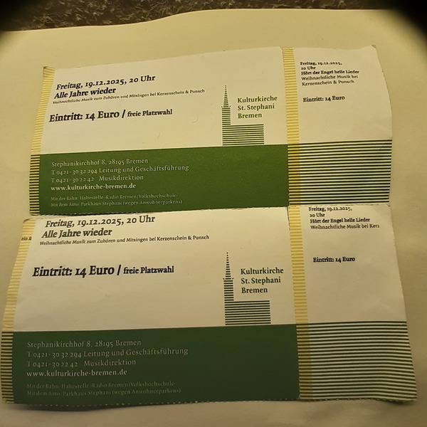 2x Weihnachtslieder Singen am 19.12. in der Kulturkirche St. Stephanie je 12€.
