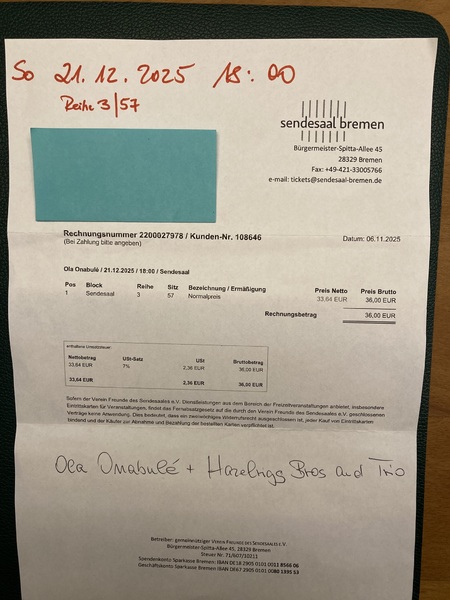 Biete Ticket für Ola Onabule und Hazelrigg Brother am 21.12.2015 um 18:00 Uhr im Sendesaal Reihe3 Platz 57 für 20€ (Statt 36€).