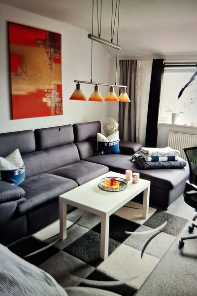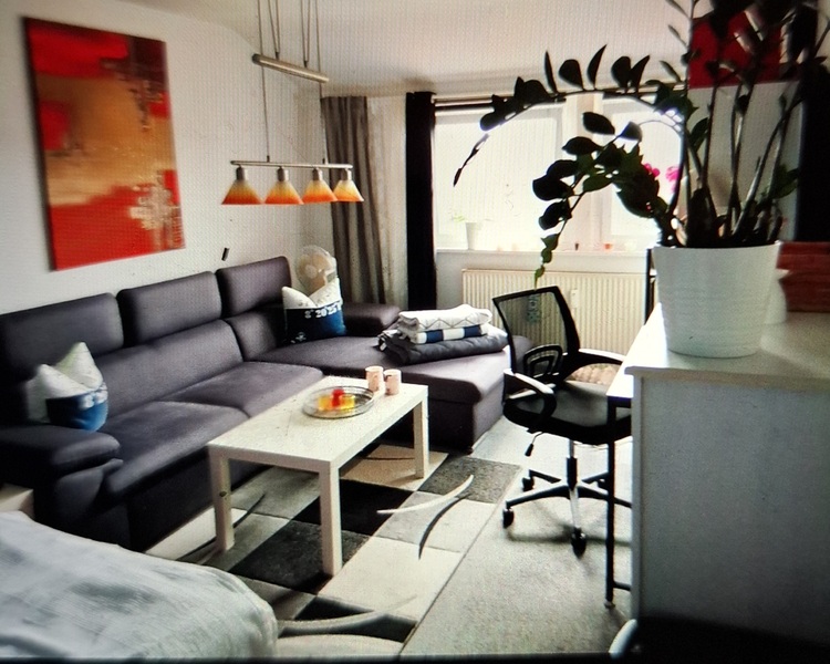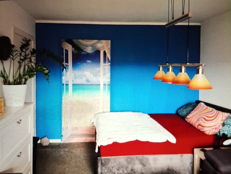 Über der Couch befindet sich ein schönes Bild in rot das den ganzen Raum abrundet. Unter dem Tisch ist ein großer roter Teppisch der auf grauer Auslegeware liegt. Über den Tisch hängt eine schicke Tischlampe. Ich habe neue Jallosien in grau angebracht und 2 schöne Blickdichte Vorhänge in Samt Schwarz sorgen für einen guten und erholsamen Schlaf.