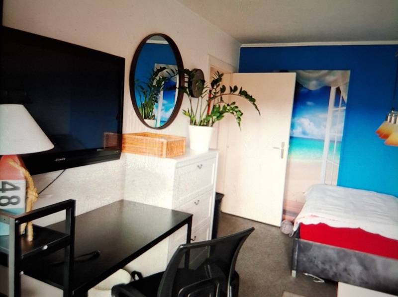 Das Zimmer verfügt über eine sehr große und ausklappbare Couch in Grau. Und einen Bettkasten für viel Stauraum. Es steht ein sehr schicker neuer Schreibtisch in Schwarz mit einen neuen schwarzen und bequemen Stuhl zur Verfügung (und einer Lampe). Sowie ein großer TV mit guten Bild. In dem Zimmer befindet dich noch eine schöne Kommode in grau 3 Schubladen mit viel Stauraum.