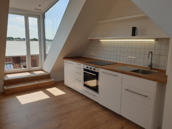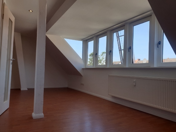 Die Vier-Zimmerwohnung 100 m² (komplett neu renoviert), liegt im Dachgeschoss, eines Mehrfamilienhauses, auf zwei Etagen. Die Dachgeschosswohnung hat drei Schlafzimmer (sind alle frei), ein Gemeinschaftswohnzimmer, mit Küche, zwei Dachterrassen (12 und 6 m²) und ein Badezimmer. Ein Gemeinschaftsgarten ist vorhanden und kann mit benutzt werden. Eine Kellerabstellbox ist inbegriffen.