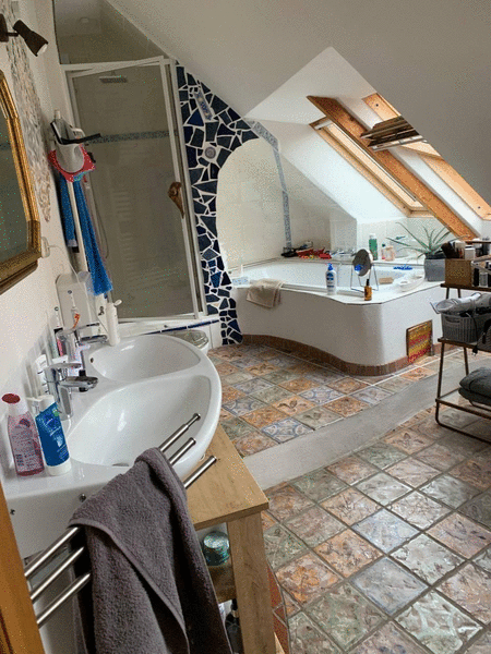 5 Zimmer, 1 Badezimmer mit Dusche und Badewanne, ein zusätzliches WC, eine große Wohnküche