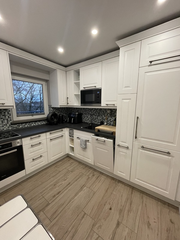 In der Küche finden Sie eine sehr hochwertige Einbauküche mit genügend Stauraum vor. Elektroherd & Backofen, Spülmaschine, im Wandschrank verstaute Mikrowelle und Kühl-Gefrierkombination sind von Top-Herstellern.