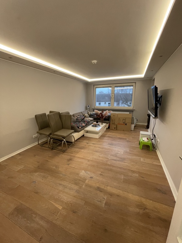 2020 wurden Elektrik, Wand- und Deckenbeläge sowie Beleuchtung (indirekte Beleuchtung und Spots) erneuert. Ebenso wurde in den vergangenen Jahren eine elektrische Markise über der Loggia installiert. Des Weiteren wurden die Türen lackiert und neue Türgriffe angebracht. Wie auf den Fotos zu sehen, ist in Wohn- & Schlafzimmer Echtholzparkett verlegt. Küche, Flur und Badezimmer verfügen über einen sehr stylischen Fliesenboden.