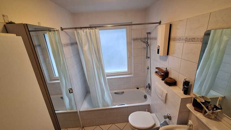 Das Bad aus den 90er-Jahren ist gepflegt und funktional. Warmwasser in Bad und Küche wird über Durchlauferhitzer bereitgestellt.
