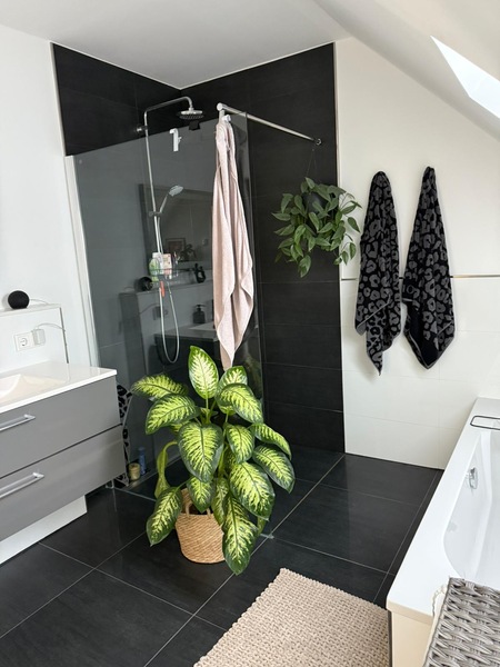 Durch einen weiteren Durchgang erreichen Sie linksseitig abgehend vom Wohnbereich einen kleinen Flur, von dem Sie das Schlafzimmer und Badezimmer erreichen. Das Badezimmer ist mit zwei maßgefertigten Einbauschränken und einem schönen Spiegel mit indirekter Beleuchtung ausgestattet. Außerdem gibt es sowohl Badewanne als auch bodentiefe Dusche.