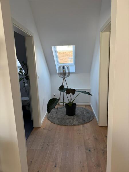 In der ersten Etage angekommen, geht es linksseitig ins Gäste-WC, in welchem sich ein Einbauschrank für Waschmaschine und Trockner befindet. Rechtsseitig befindet sich ein weiteres Zimmer, welches als Schlaf-/Kinder-/ Ankleide- oder sonstiges Zimmer genutzt werden kann. Außerdem können Sie hier auch die Holztreppe ins obere Geschoss finden.