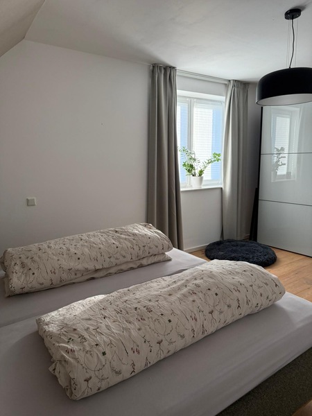 Im oberen Geschoss finden Sie einen langen Raum, der mittels Einbauschränken und einer Tür in zwei Zimmer unterteilt ist. So eignet sich der hintere Raum als weiteres Schlaf- / Gästezimmer. Der vordere Bereich ist aktuell als Fitnessraum umfunktioniert.