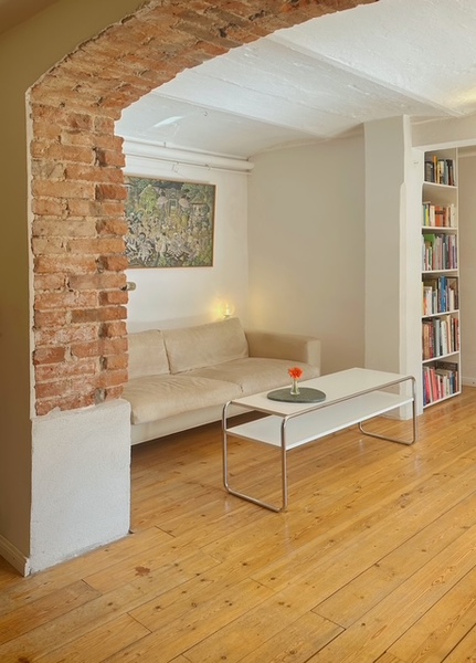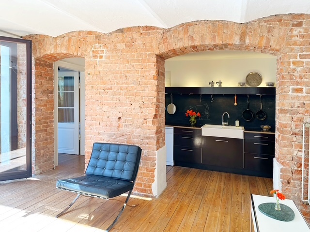 Der grosse Wohn- und Essbereich besitzt Backsteinwände und Kappendecken.