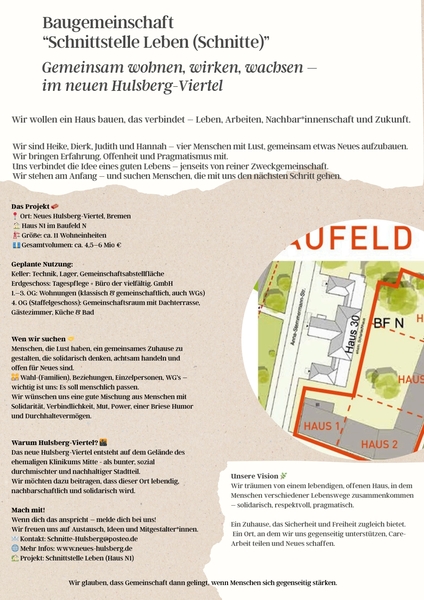 wir sind vier Menschen (Heike, Dierk, Judith und Hannah), die gerade dabei sind, im neuen Hulsberg-Viertel in Bremen ein Hausprojekt aufzubauen: