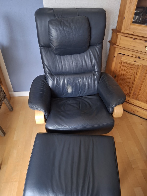 Relaxsessel, Leder blau mit passendem Hocker Gebrauchsspuren in der Rückenlehne, Abholung in Schwachhausen