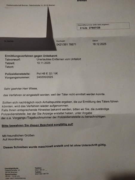 Ort mit Umkreis Tenever, Arbergen, Mahndorf, Sebaldsbrück, Hastedt, Vahr. Motorroller rammte Auto.