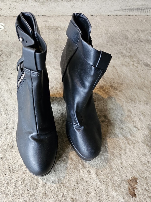 Schwarze Damen Stiefellette, Gr.38, H&M, hoher Absatz ca. 6cm, kaum getragen. Reißverschluss, Gurt Schnalle alle über dem Fussbereich. Preis: 15 Euro V.B