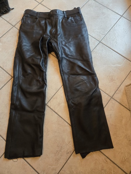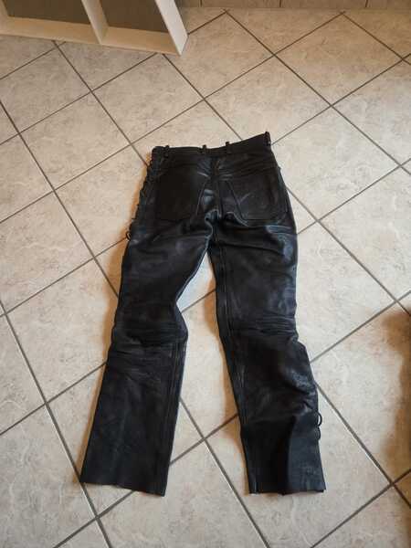 Motorrad Lederhosen in schwarz, Gr. M, zwei Stück, gerade geschnitten, mit Hosentaschen vorne, hinten, Weite 45cm, Schlaufen für Gürtel vorhanden. Guter Zustand ohne Beschäftigungen. Preis für beide: 100 Euro V.B.