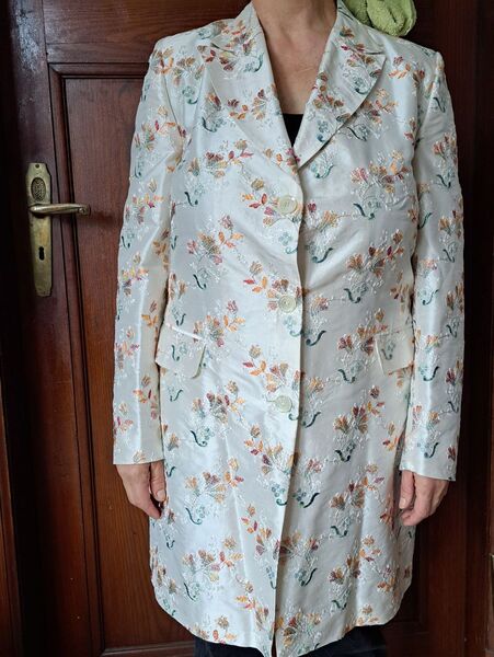 Sehr eleganter Longblaser zu verkaufen, Marke Stiesing (Bremen), Grundfarbe offwhite/creme mit Blumenstickerei. Das Schild zum Material fehlt leider (Seide?). Größe etwa 44.
