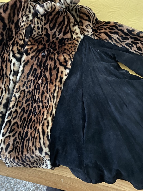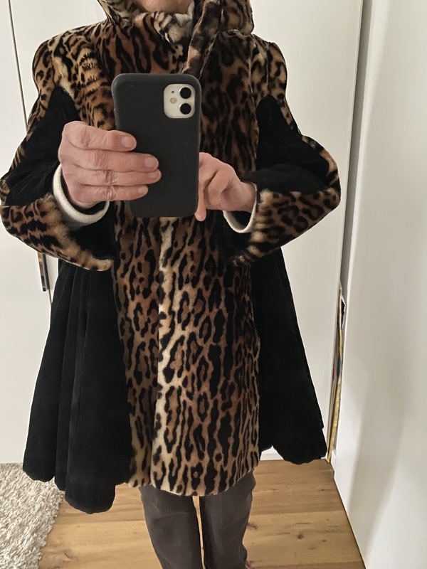 Mein Pelzmantel ist von einer Designerin gearbeitet, vorn und hinten Schaffell mit Leopardendruck und seitlich schwarzes Wildleder eingearbeitet, damit es schlanker aussieht, sehr selten getragen. Größe 40/42. Preis: 80€ nur.