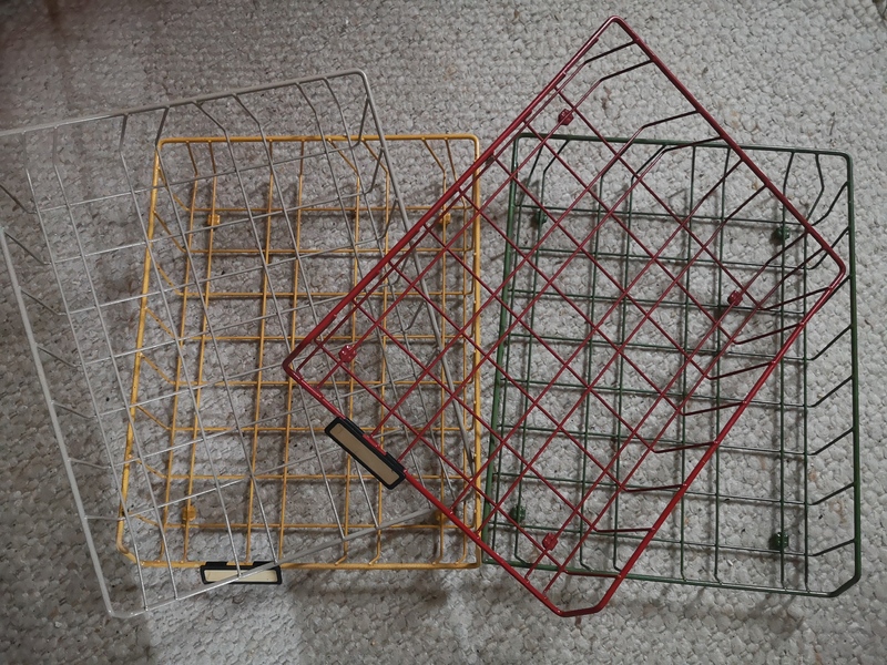 Im Angebot 4 farbig ummantelte Metallgitter Ablagen – NICHT stapelbar, nur einzeln und/oder nebeneinander aufgestellt nutzbar – für verschiedene Flyer oder Bastelpapiere bspw. Siehe Bild – nur Abholung in der Neustadt.