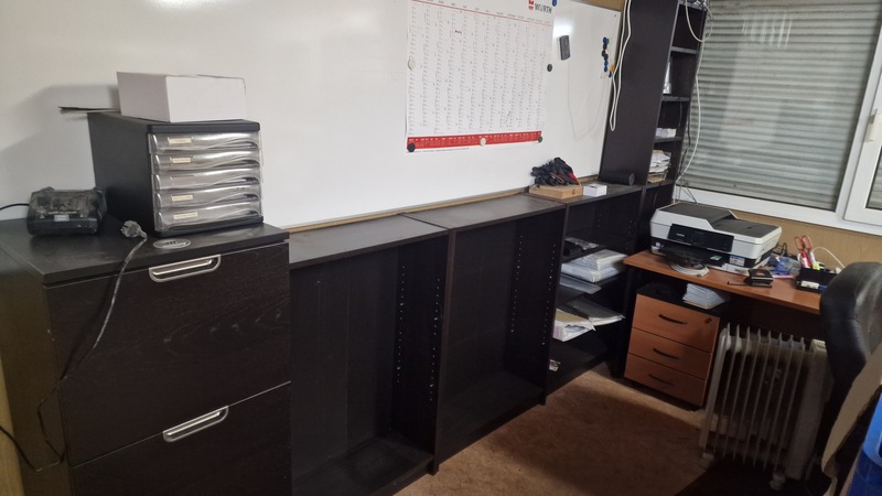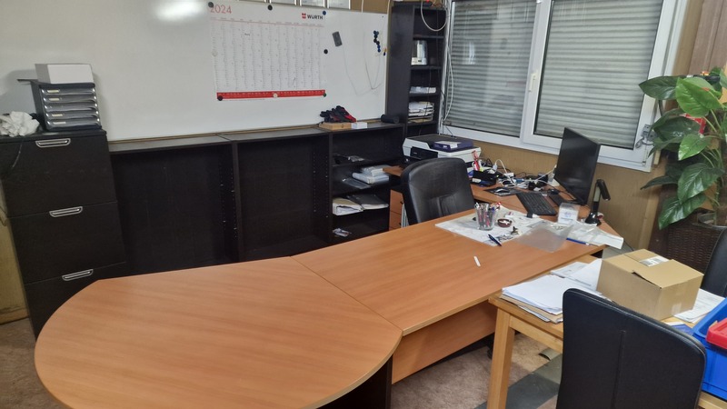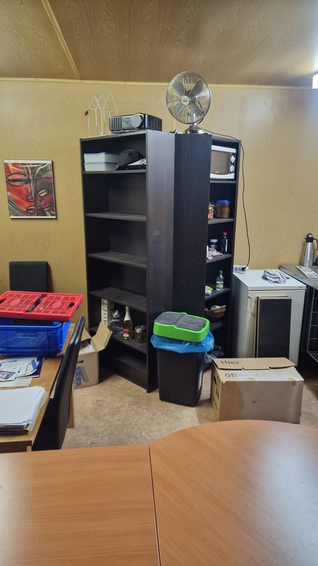 Eckschreibtisch mit Besprechungsrunde. 1 Schreibtischcontainer, 3 Regale h 106 cm x b 80 cm, 1 Eck-Hochregal, 2 Hochregale h 202 cm x 40cm und 80cm, 1 Hängeregisterschrank. Optional 2 Stühle.