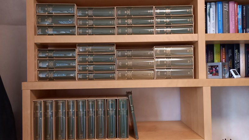 34 Bände der Sammlung "Nobelpreis für Literatur" aus dem Coron-Verlag, Jahrgänge 1901 bis 1999 plus Zusatzband. Ungelesen und sehr gut erhalten. Taftseideneinbände mit Goldprägung und Kopfgoldschnitt. Alle Bände (bis auf den Begleitband) im schützenden Pappschuber. Komplette Sammlung für € 340 zu verkaufen.