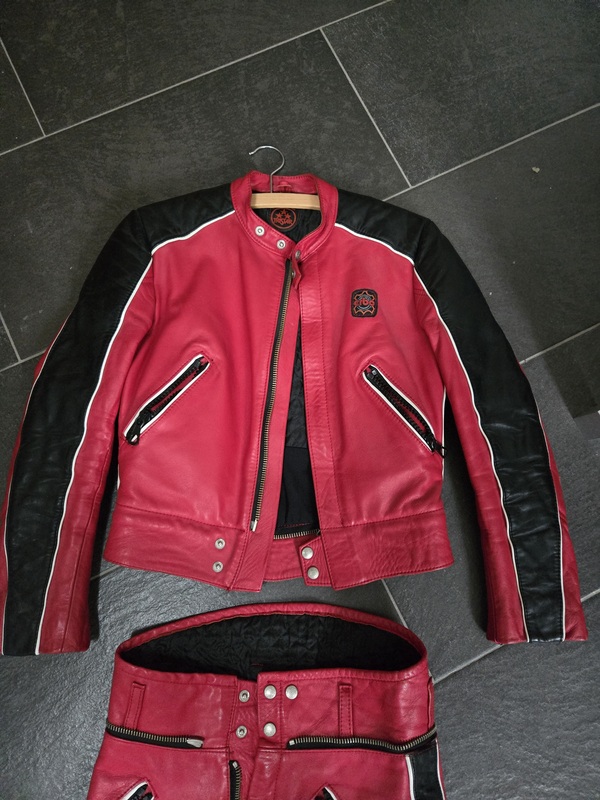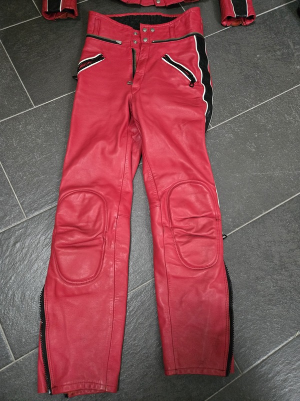 Neuwertige Damen Motorrad-Lederkombi, Grösse 84 in rot mit schwarz-weissen Absetzungen von Erbo (Tristar). 2-teilig, mit Reissverschluss verbindbar.