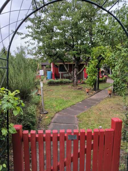 Laube: Holzlaube Bj. 1977 mit Satteldach 20 qm, Dachboden gedämmt, Küche