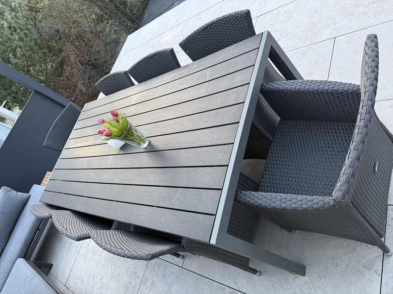 Verkaufe acht Gartenstühle von Sunfun und einen Gartentisch mit den Maßen 2,00 m x 1,00 m in der Farbe anthrazit. Die Stühle sind fest und haben somit keine verstellbare Rückenlehne. Für jeden Stuhl ein passendes eckiges Kissen aus dem Baumarkt hatte ich dazu gekauft in beige. Die sind nicht auf dem Foto, gebe ich aber dazu. Macht mir gerne ein realistisches Preisangebot.