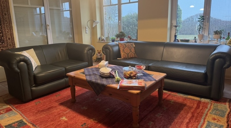 Das Set besteht aus einem 2er und einem 3,5er Sofa in dickem, robusten, gepflegtem, dunkelgrünen Leder - Maßanfertigung aus England. (Neupreis ca. 5000 EUR)