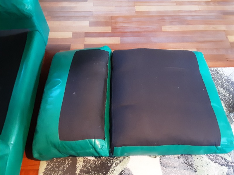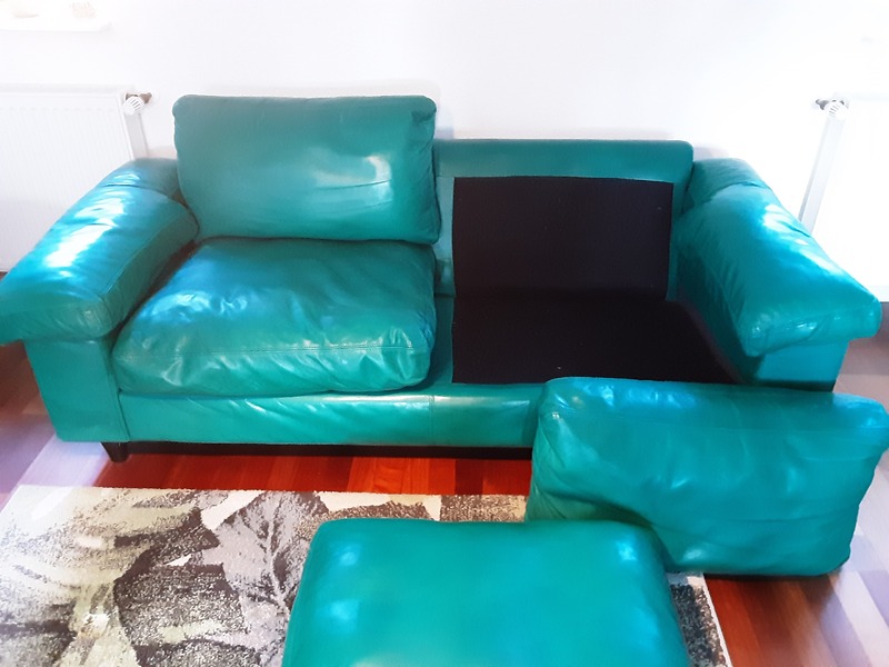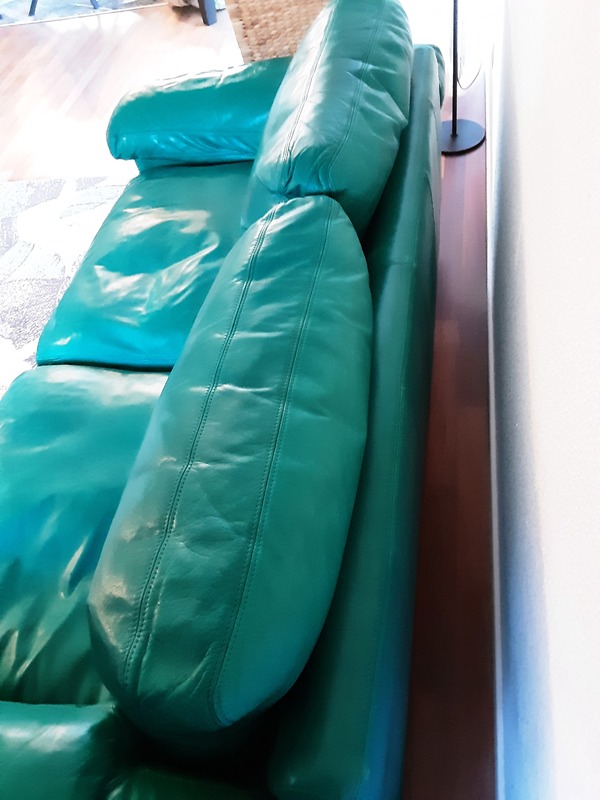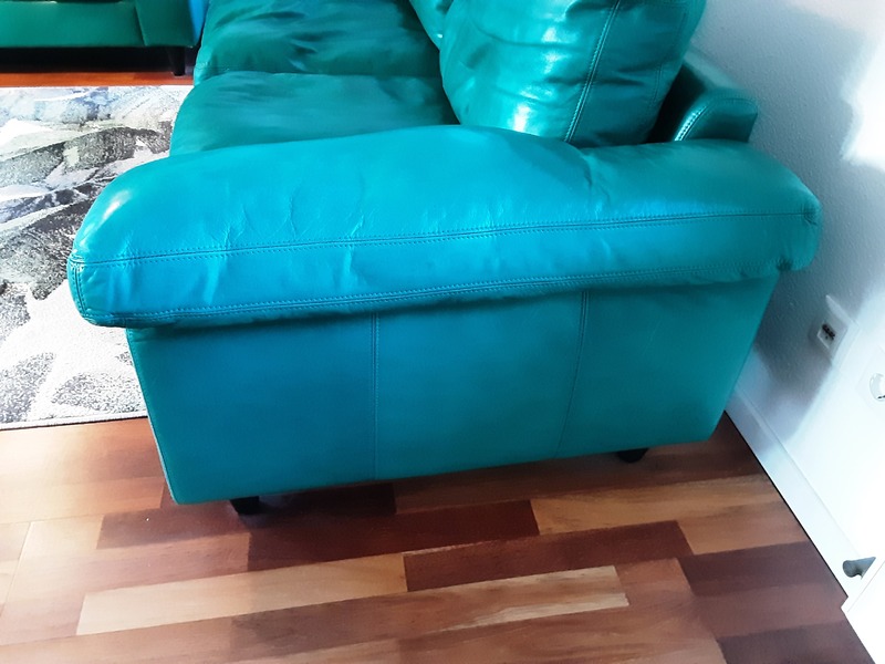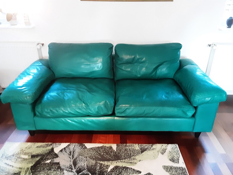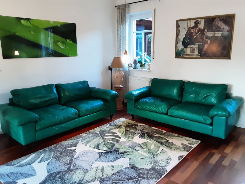 Es werden 2 hochwertige Ledersofas in dem Farbton Gazelle grün angeboten. Sie bestehen aus handschuhweichem Rinder-Dickleder. Alle Kissen sind mit Daunenfedern gefüllt. Regelmäßige Lederpflege wurde durchgeführt. Das Gestell ist nicht gefedert. Die Füße bestehen aus Holz. Alle Kisseninlets können zwecks Reißverschlüsse entnommen werden. Der Rücken besteht auch aus Leder.