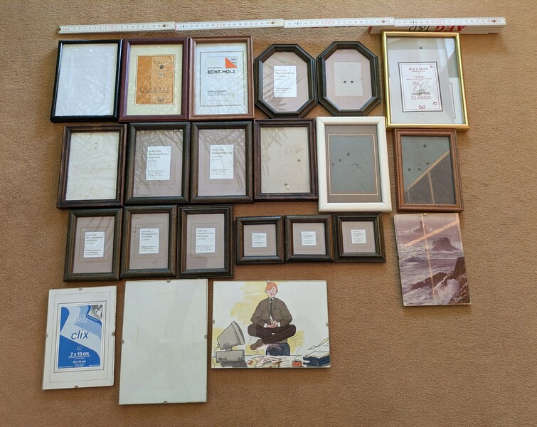 Verkaufe 35 Bilderrahmen z. T. Echtholz und Aufsteller und 4 kleine Wechselrahmen.