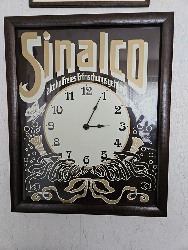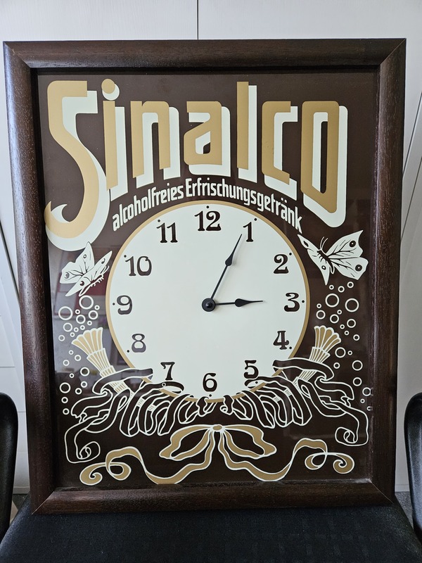 Ich möchte mein Sinalco-Blechschild mit einer Uhr verkaufen.